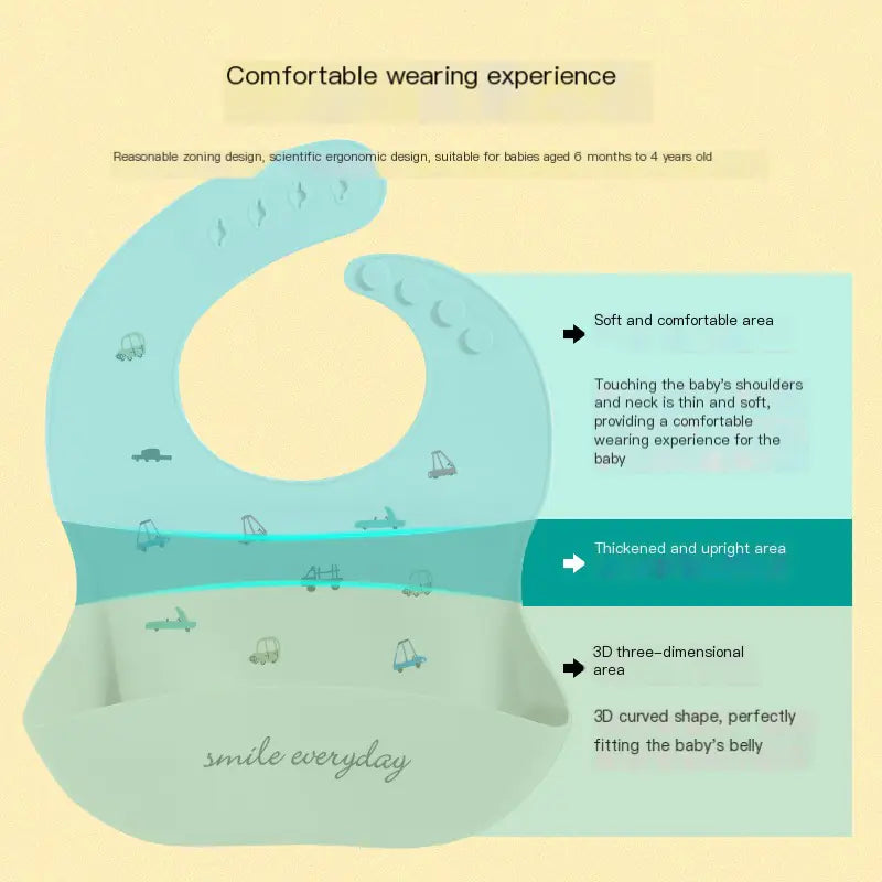 Crafted from high-quality silicone, this bib is not only waterproof but also incredibly easy to clean. Say goodbye to stained clothes and hello to hassle-free meals! The unique rice pocket design ensures that any spills or crumbs are caught, keeping your floor clean and tidy.